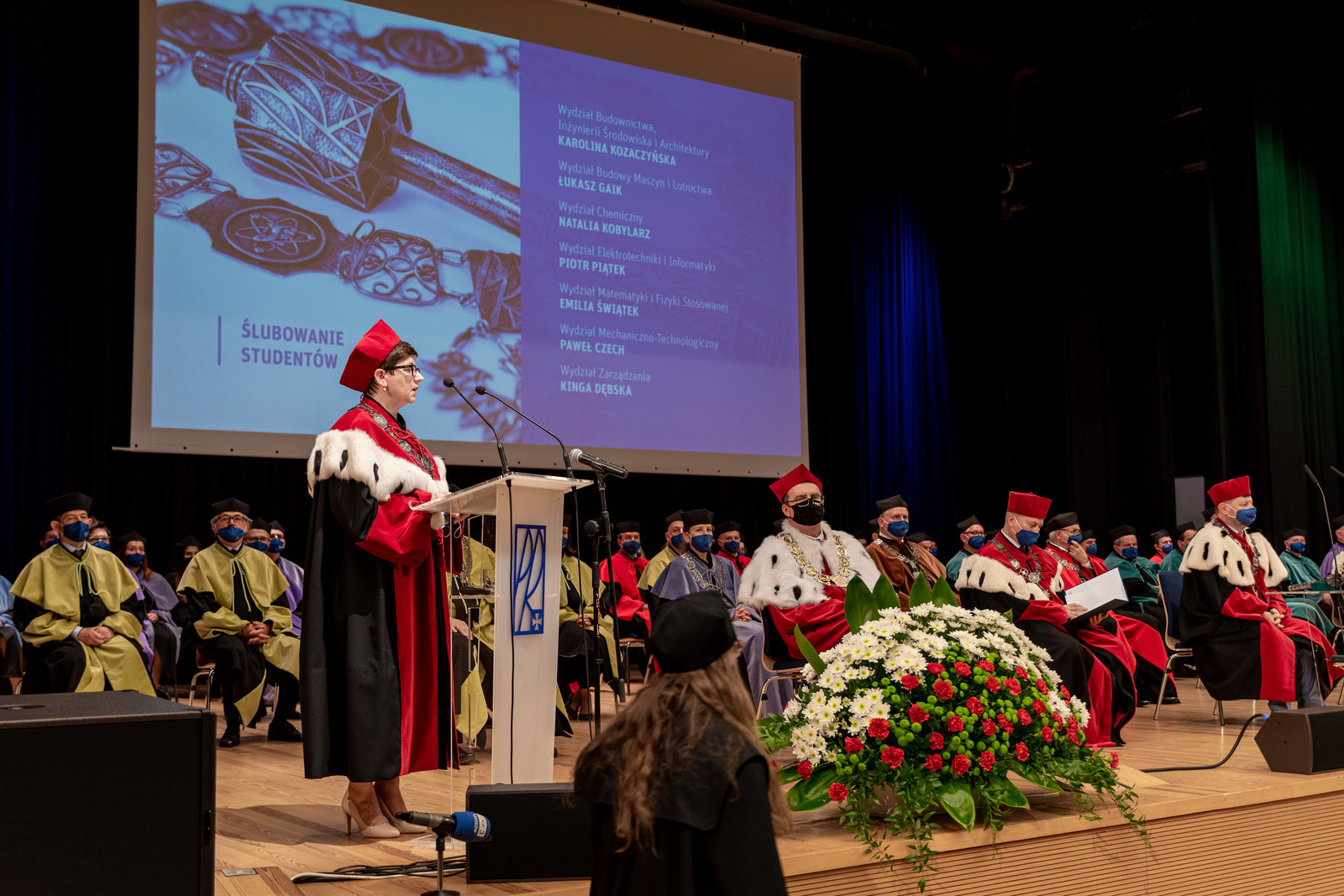 Ważną częścią uroczystości było ślubowanie przedstawicieli studentów pierwszego roku, które poprowadziła prorektor ds. kształcenia dr hab. Iwona Włoch, prof. PRz, oraz przedstawicieli doktorantów Szkoły Doktorskiej Nauk Inżynieryjno-Technicznych PRz, które poprowadził prorektor ds. rozwoju i współpracy z otoczeniem prof. dr hab. inż. Jarosław Sęp. JM Rektor dokonał pasowania studentów i doktorantów.