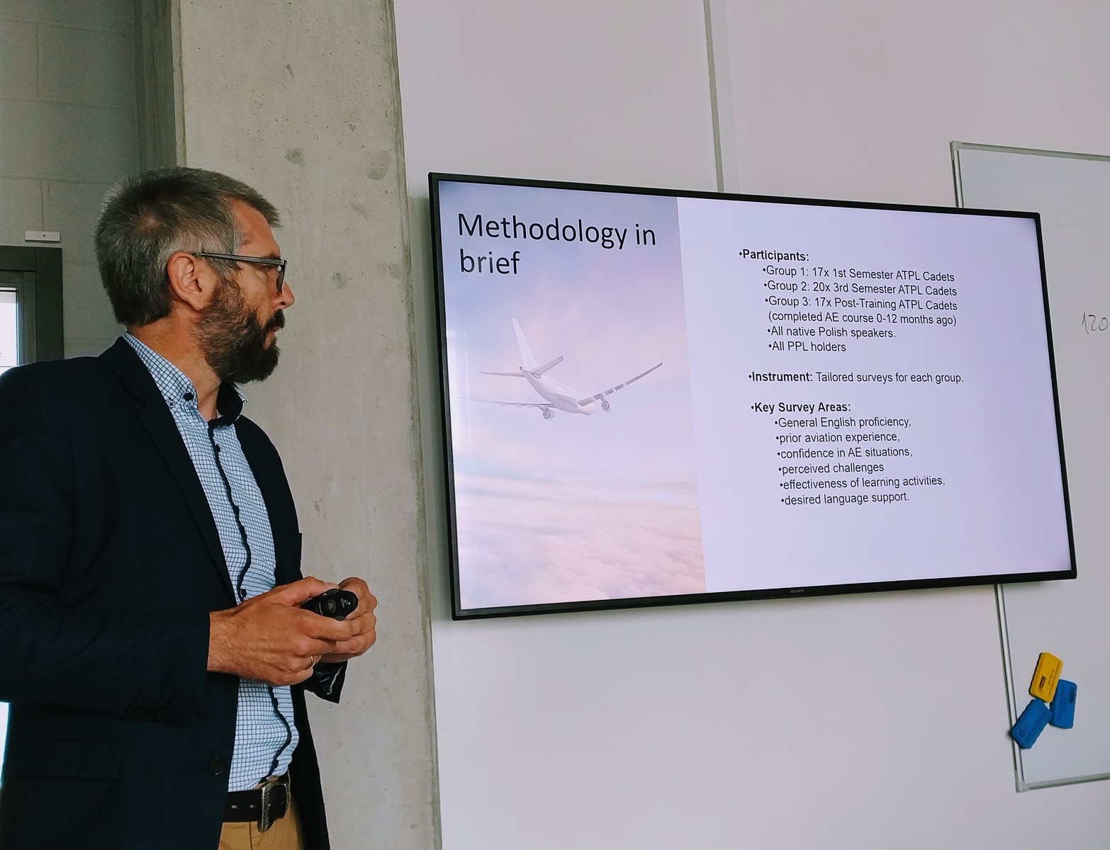 Podczas wydarzenia wyniki kompleksowej analizy dotyczącej „Dostosowania nauczania języka angielskiego w lotnictwie do potrzeb komunikacyjnych pilotów: Badanie porównawcze uczestników szkolenia ATPL” przedstawił dr Piotr Czerwiński z Centrum Języków Obcych Politechniki Rzeszowskiej. Szczególną cechą badania było jego porównawcze podejście, które objęło trzy grupy studentów: tych rozpoczynających szkolenie (1. semestr), będących w jego środku (3. semestr) oraz tych, którzy już ukończyli formalny kurs Aviation English i zbliżają się do praktyki zawodowej. Taka perspektywa pozwoliła na uzyskanie dynamicznego obrazu zmieniających się potrzeb językowych i wyzwań na różnych etapach rozwoju przyszłego pilota.