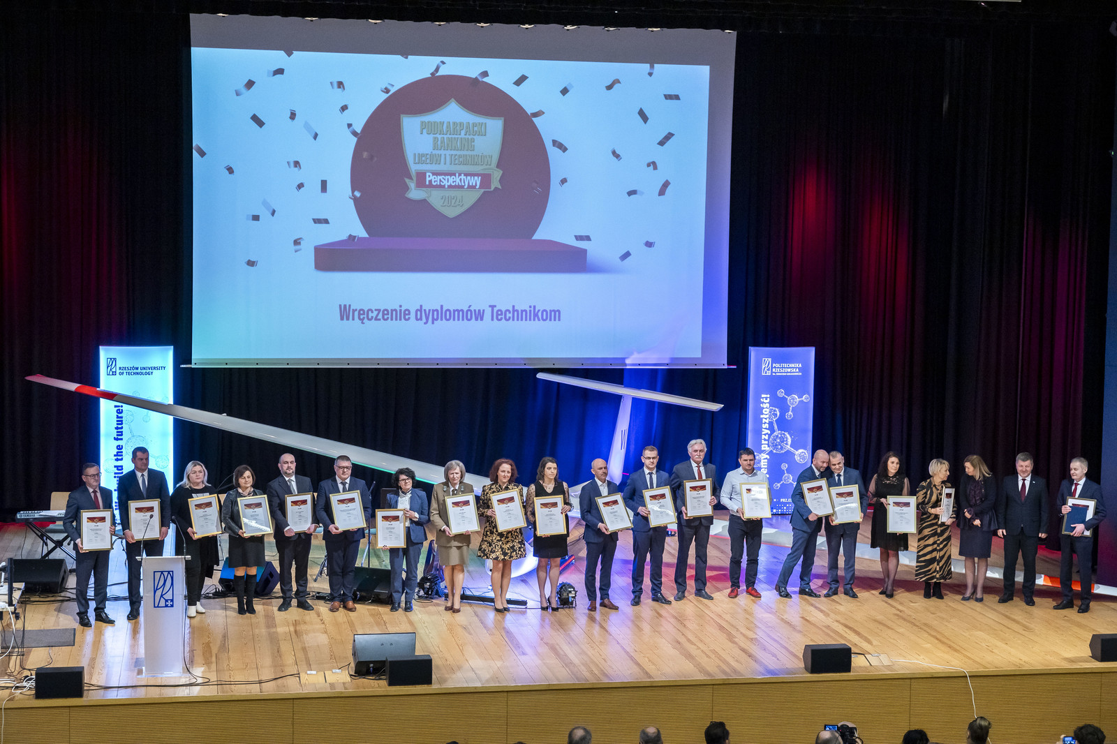 Wyróżnienia wręczono w dwóch kategoriach: 20 najlepszych liceów i 20 najlepszych techników województwa podkarpackiego. Wśród liceów na pierwszym miejscu znalazło się I Społeczne Liceum Ogólnokształcące im. Hetmana Jana Tarnowskiego w Tarnobrzegu, a wśród techników zwyciężył Zespół Szkół Elektronicznych w Rzeszowie. Rektor Politechniki Rzeszowskiej prof. Piotr Koszelnik, gratulując wyróżnionym szkołom, podkreślił, że dla uczelni to zaszczyt gościć w swoich murach grono pedagogiczne i uczniów najlepszych szkół, którzy będą niebawem wybierać swoją dalszą drogę edukacyjną. „Stoicie przed najważniejszą decyzją w życiu. Zachęcam Was, abyście rozważyli studia na Politechnice Rzeszowskiej, które dają gwarancję znakomitego rozwoju, realizacji pasji i perspektywę atrakcyjnej pracy zapewniającej dobrą jakość życia” – mówił rektor.
